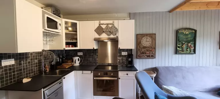 La cuisine est équipée de plaques induction ,1 micro-ondes, 1 grand réfrigérateur/congélateur, 1 four,1 lave-vaisselle.