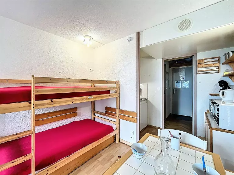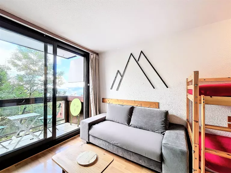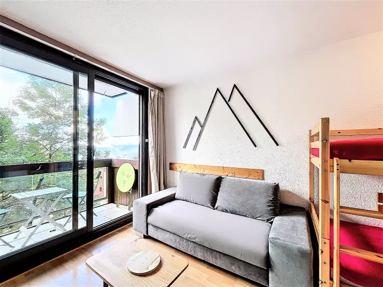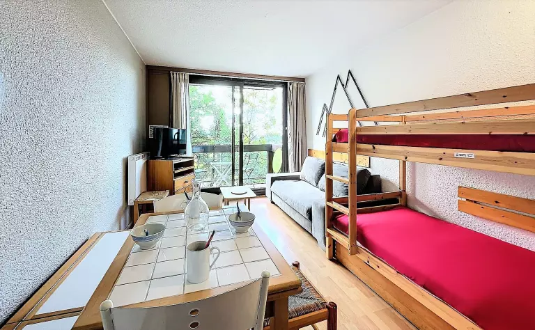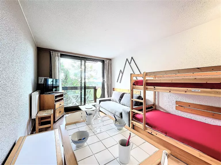 Le séjour comprend 1 canapé BZ en 140X190 pour 2 personnes et 2 lits simples en 80x190 superposés ainsi qu'une télévision à écran plat.