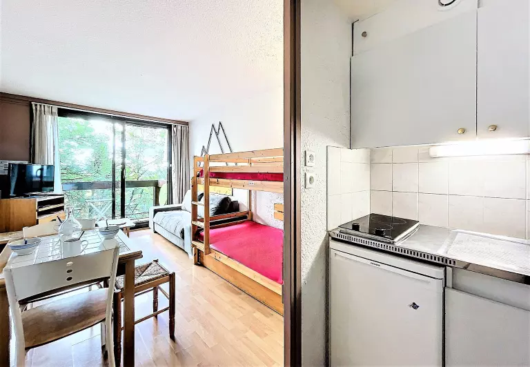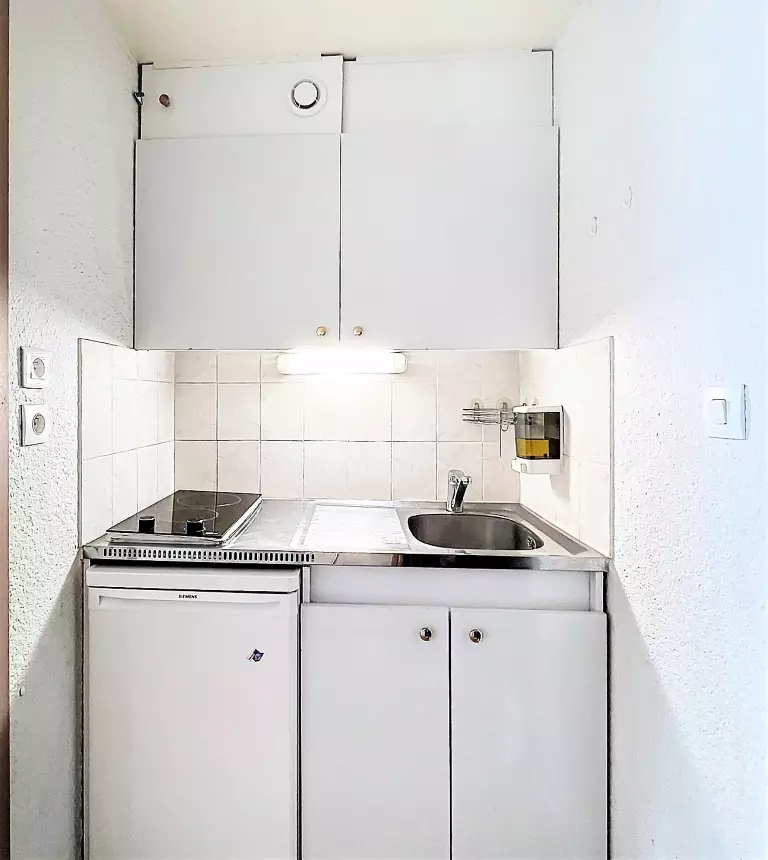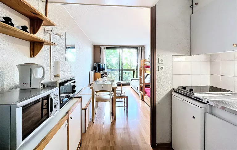 Studio bien équipé comprenant une entrée avec placard de rangement, une salle de bain avec wc, un coin kitchenette équipé de 2 plaques vitro, d'un mini four, d'un micro-ondes, et d'une cafetière Dolce Gusto®, bouilloire, grille pain, appareil à raclette, appareil à croque Monsieur et appareil à fondue.