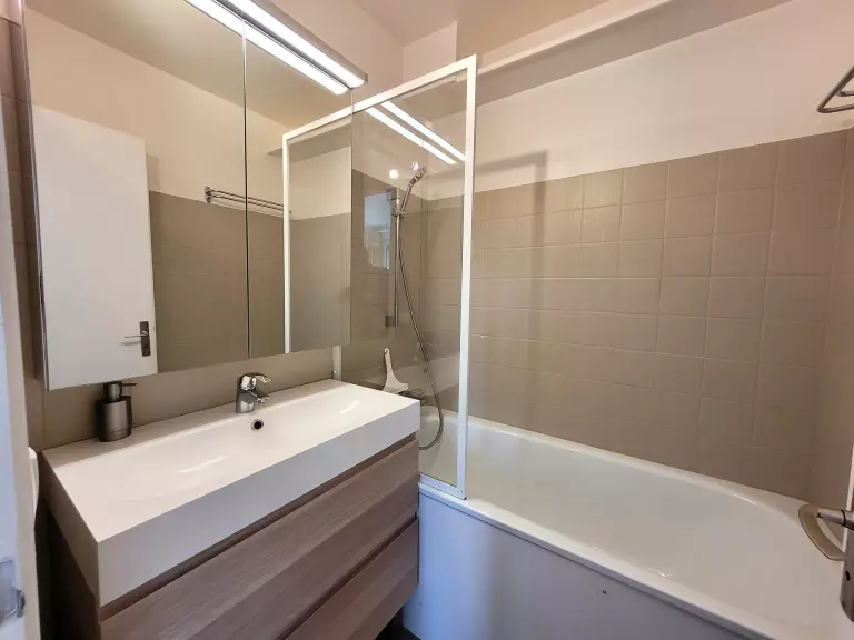 - 1 salle de bain avec baignoire, lavabo, sèche serviette électrique.