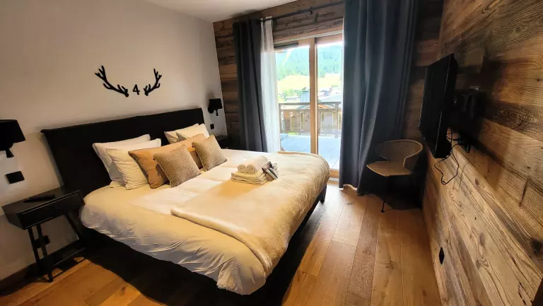 - 1 chambre master mansardée avec vitres cathédrales et grandes baies vitrées avec vue panoramique sur les Gets, bain et douche. Lit 180x200, TV, dressing et canapé convertible