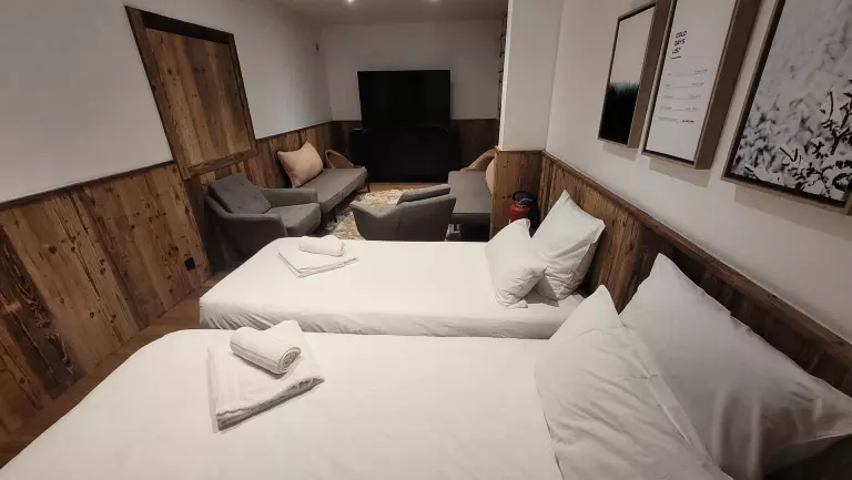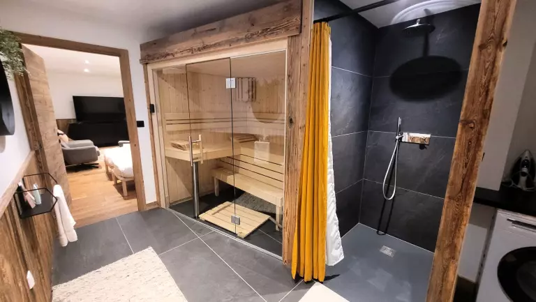 Au -1 : Une chambre cabine équipée de 2 lits simples de 80cmx200cm pouvant être préparés en lit double, un sauna avec douche, espace lingerie