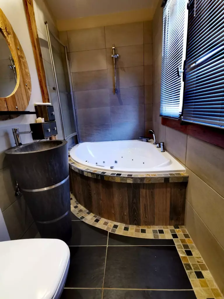 - Une chambre en suite avec lit 140x190cm et rangement, baignoire balnéo, meuble vasque et WC