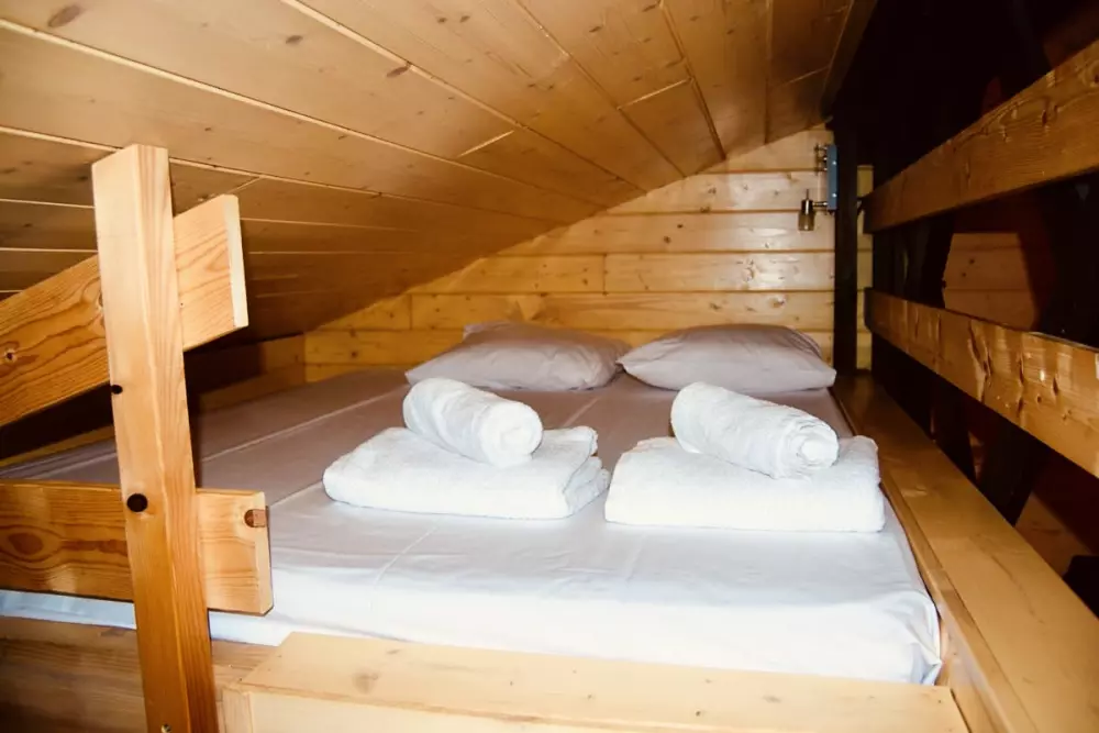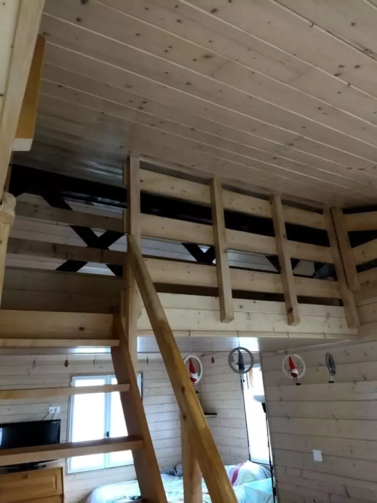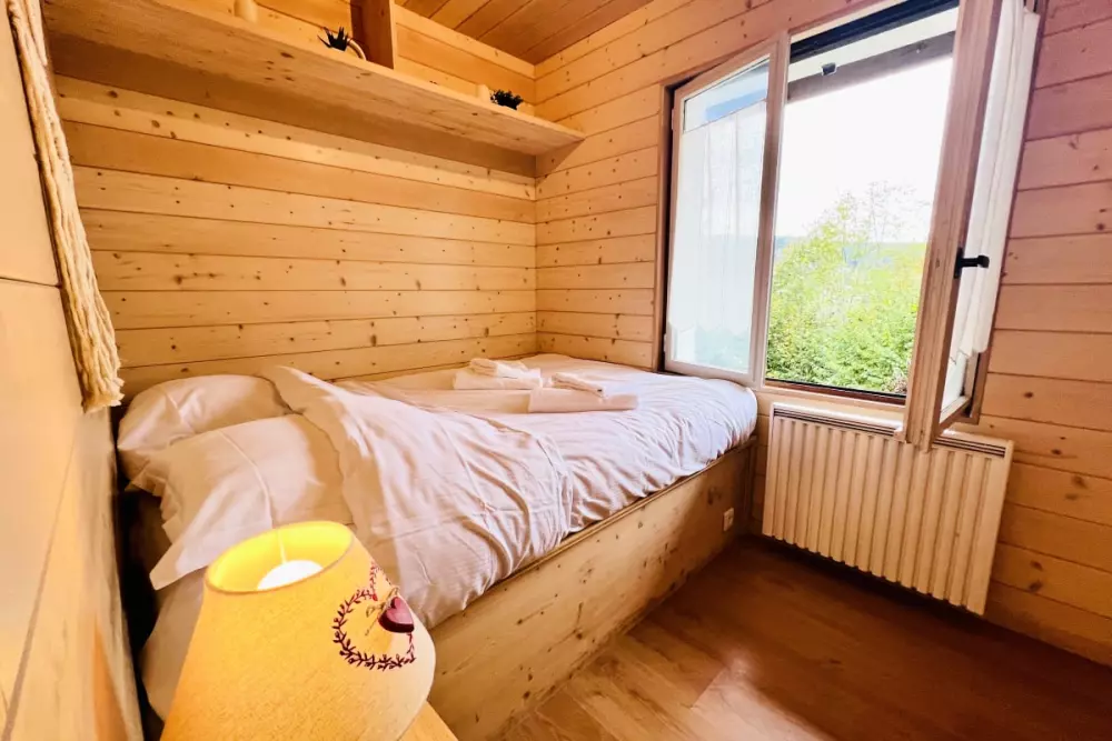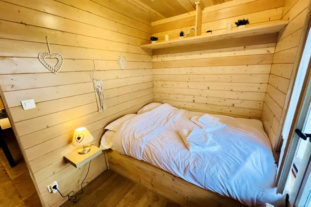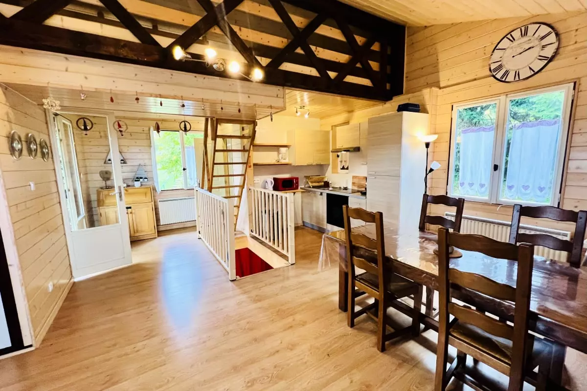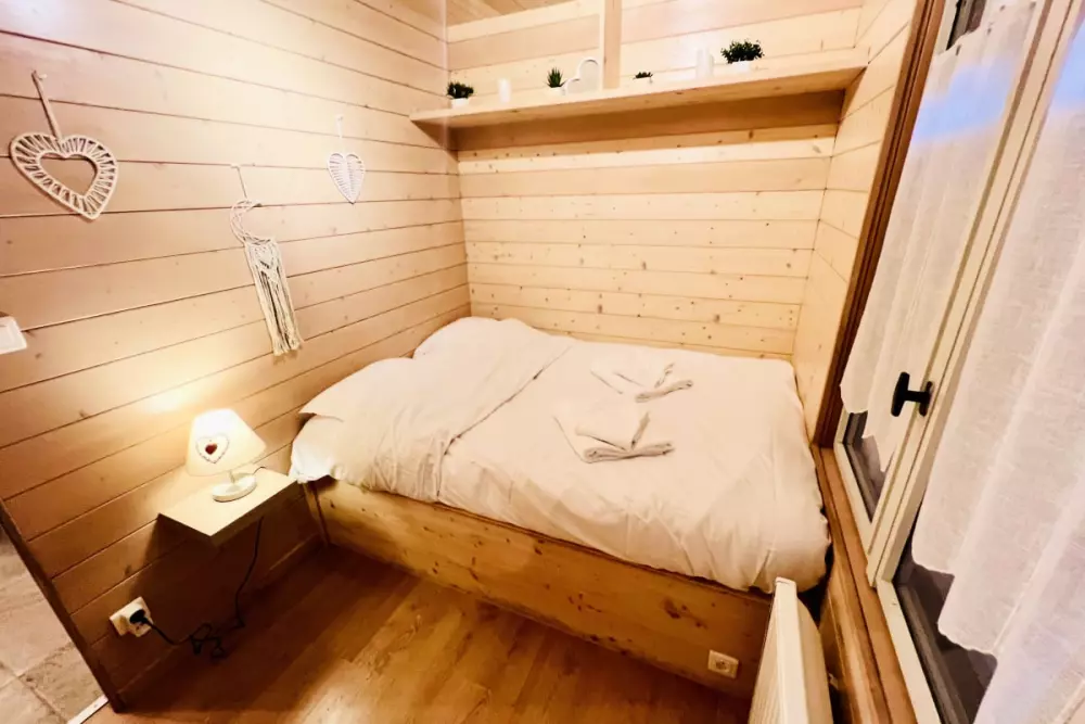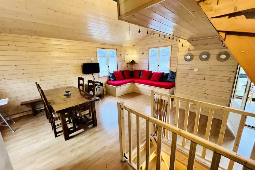 Dans ce charmant petit chalet, vous trouverez une chambre avec un lit double, idéale pour un repos confortable. Un lit superposé est également disponible, offrant 2 lits simples pour accueillir plus de personnes. Le salon dispose d'une mezzanine ouverte, accessible par un escalier, où vous trouverez un lit double pour un espace de couchage supplémentaire.