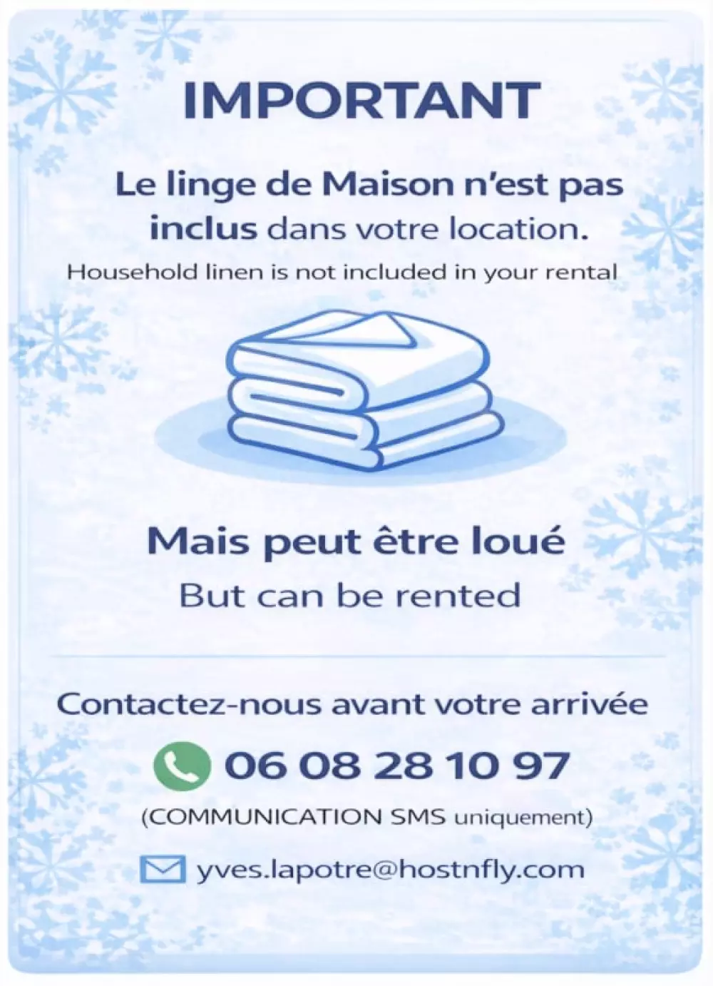 Un lit parapluie, une chaise ainsi qu’une baignoire pour bébé sont à votre disposition, parfait pour les familles avec jeunes enfants. Un sèche-cheveux et un lave-linge sont également fournis pour plus de confort. Et si vous avez la moindre question, n'hésitez pas à demander à Yves, il saura vous guider et rendre votre séjour encore plus agréable.