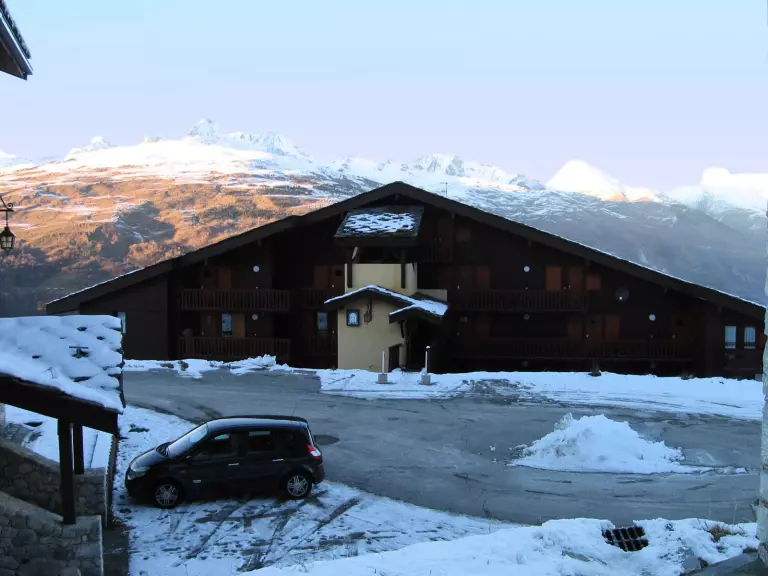 La terrasse avec vue sur les Mont Blanc est exposée Nord. Le casier à skis est dans la résidence.