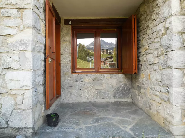 La terrasse avec accès direct et vue sur les pistes est exposé Est. Le casier à skis est dans la résidence.