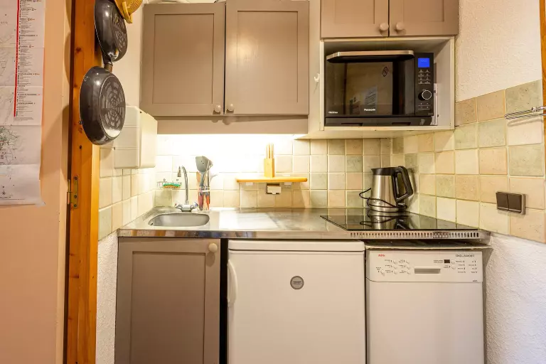 - un coin cuisine composé de 1 four mixte, 1 lave vaisselle, 2 plaques vitrocéramique, 1 réfrigérateur, cafetière filtre, cafetière Senseo, grille pain, bouilloire, service à raclette, service à fondue