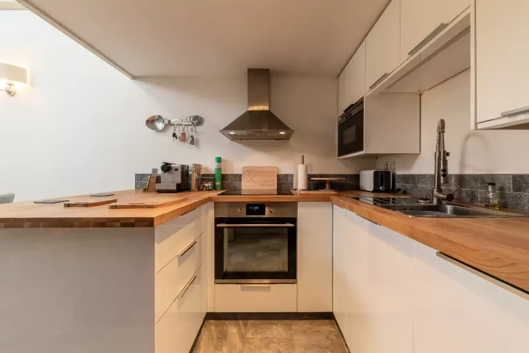 Elle est toute équipée avec un four, un lave-vaisselle, un micro-ondes, un réfrigérateur et des plaques vitrocéramiques.