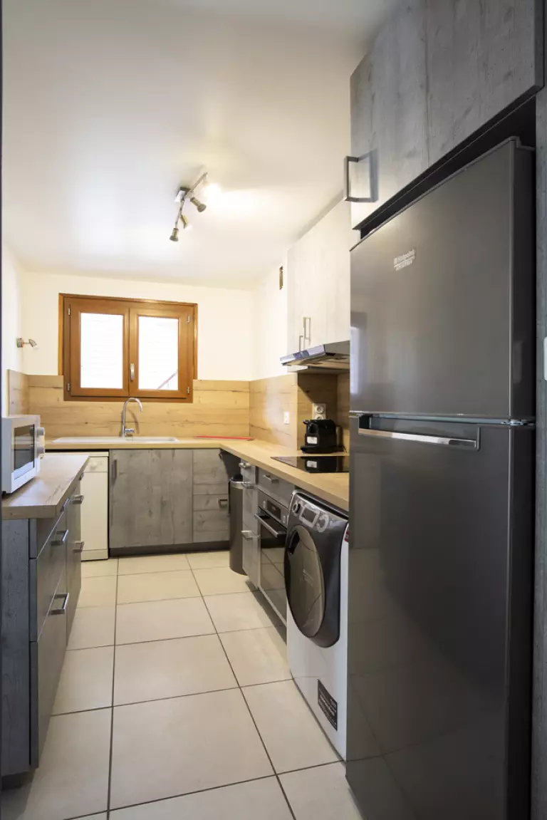 Cuisine indépendante : four, micro-ondes, lave-vaisselle, réfrigérateur/congélateur, plaque vitrocéramique (4 foyers) et lave-linge séchant.
