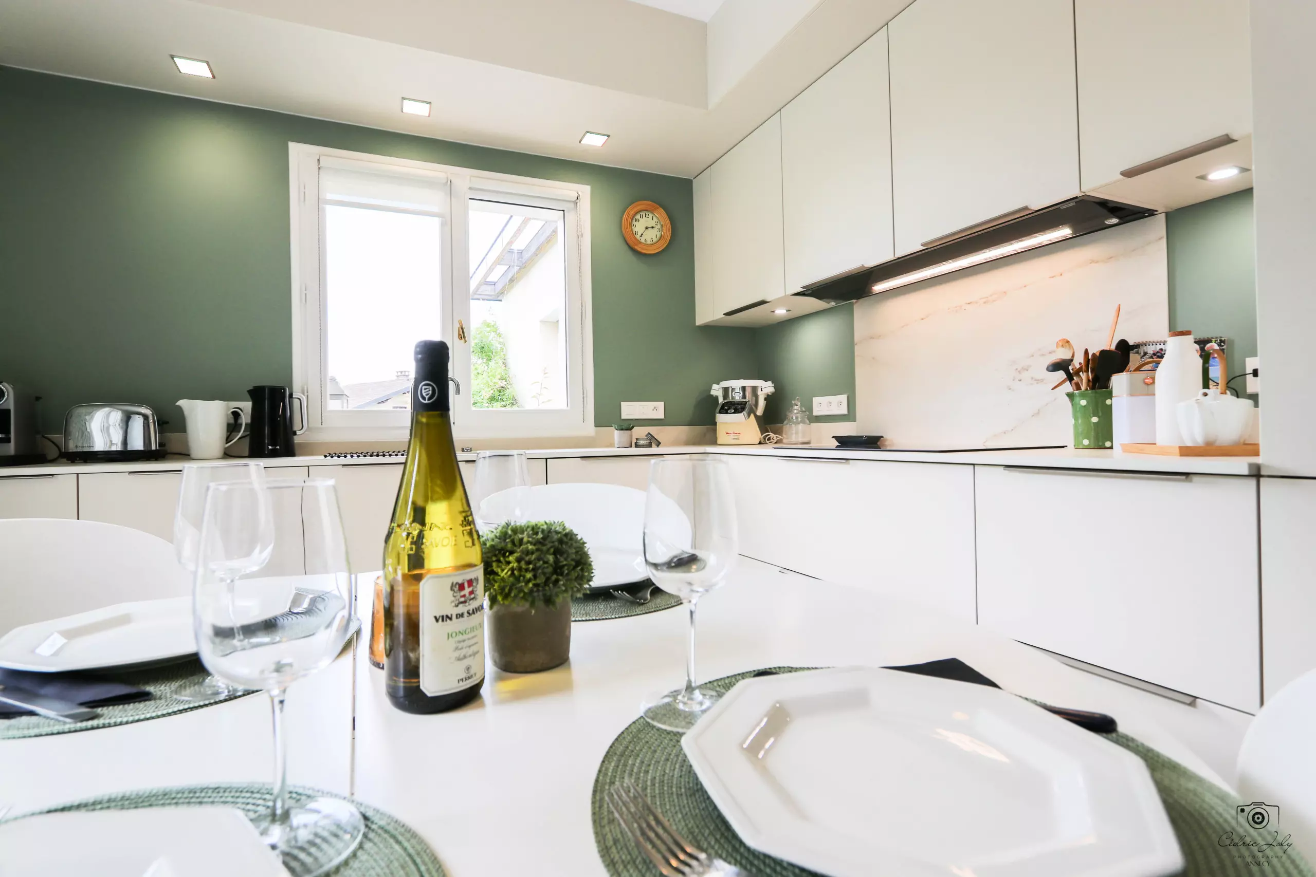 - Cuisine entièrement équipée de 15m2 disposant des équipements suivants : réfrigérateur, lave-vaisselle, plaque 3 feux gaz et 1 plaque électrique, four, micro-ondes, cafetière à filtre et cafetière Nespresso, 1 chaise haute BB