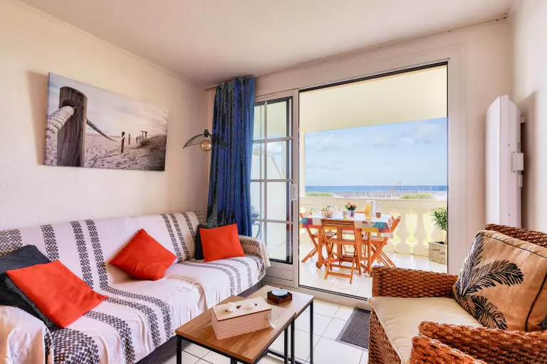 Depuis l'entrée, en arrivant dans la pièce principale, la vue vous attire immédiatement vers le balcon de 8 m². Vous y trouverez du mobilier de jardin pour vos repas en extérieur et deux transats pour vous relaxer. Un barbecue électrique est également à disposition pour de bonnes grillades face au port de plaisance.