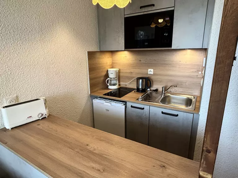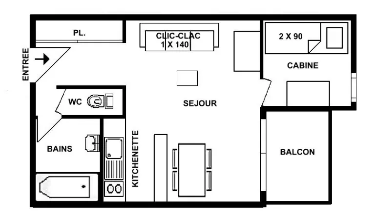 L'appartement se compose d'un séjour avec un canapé clic clac 140 et d'une kitchenette équipée ouverte, d'une cabine avec lits superposés 2x80 (NB: le lit supérieur d'un lit superposé est interdit aux - de 6 ans), d'une salle de bain et WC séparé.