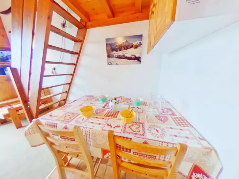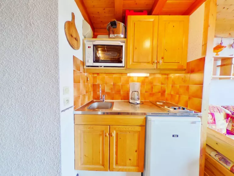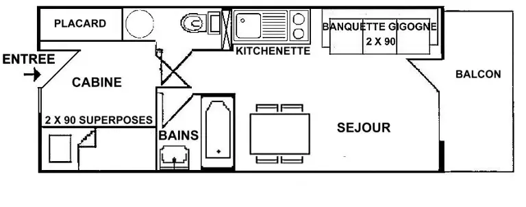 L'appartement comprend une kitchenette équipée, un séjour avec une banquette gigogne 2x90, une cabine avec lits superposés 2x90, une salle de bains et un WC séparé.