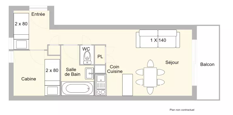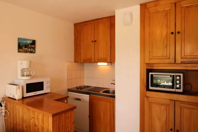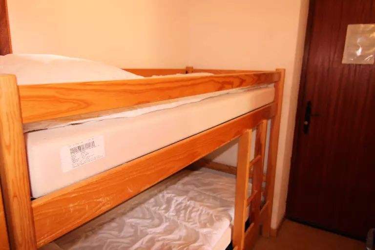 L'appartement comprend une kitchenette équipée,un séjour avec un canapé lit en 140, une cabine avec un lit 1 personne en 80 et un lit tiroir 1 personne en 80, une alcôve avec des lits superposés 2 x 80 et une salle d'eau avec wc séparé (N.B: le lit supérieur des lits superposés est interdit aux - de 6 ans).