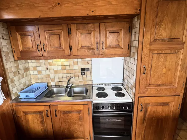 Cuisine : cuisinière électrique 4 plaques avec four, réfrigérateur avec conservateur.