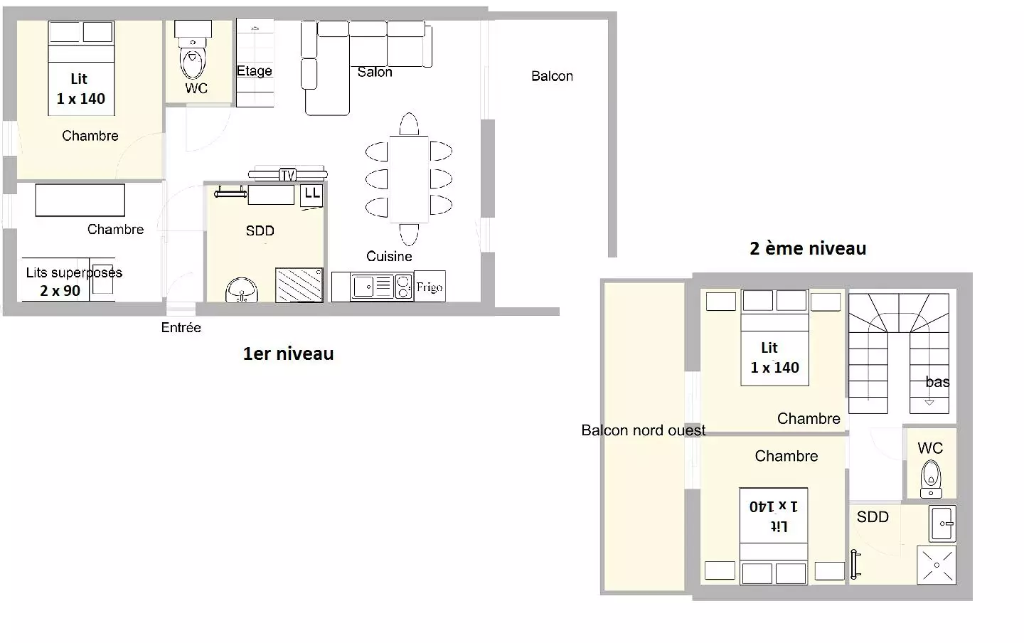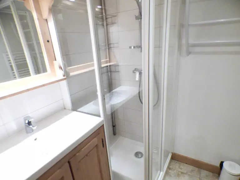 Appartement 5 pièces situé au 1er étage de la résidence sans ascenseur (1/2 étage à monter), orienté est-sud avec balcon avec garage individuel N°1 (H.2.07m.; L.4.15m.; L.2.38m.). L'appartement comprend au premier niveau : une cuisine ouverte sur le séjour, une petite chambre avec des lits superposés 2x90, d'une chambre avec un lit en 140, une salle d'eau et wc séparé, au deuxième niveau : 2 chambres avec 1 lit en 140 et une salle d'eau avec wc séparé (N.B : le lit supérieur des lits superposés est interdit aux - de 6 ans).