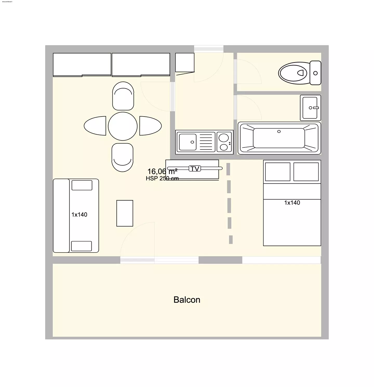 L'appartement se compose d'une kitchenette équipée, d'un séjour avec un canapé convertible en 140 et d'une cabine avec un lit double en 140, d'une salle de bains et un WC séparé.