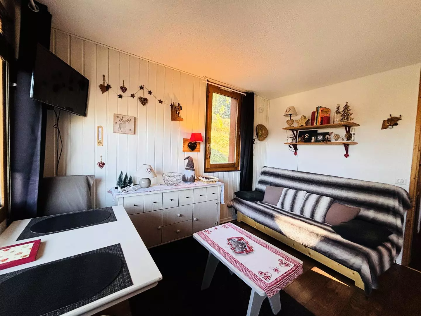 - un séjour avec 1 canapé clic clac, 1 TV
