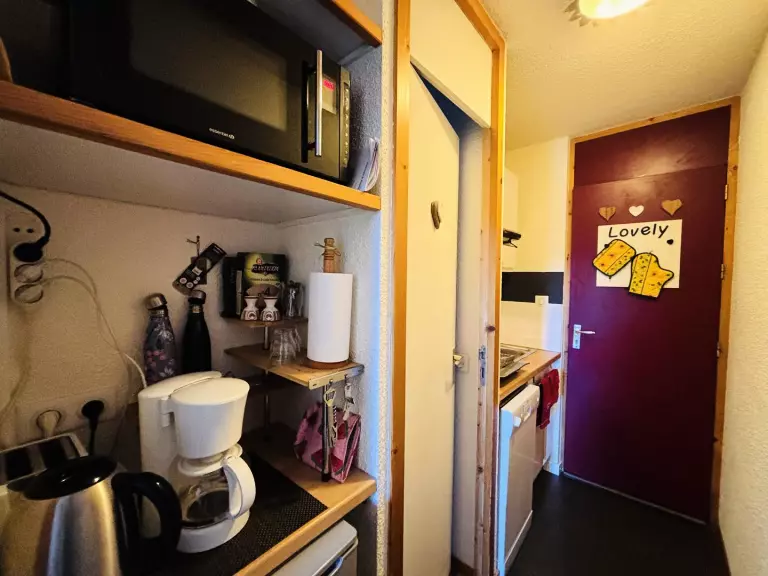 - une cuisinette dans l'entrée composée de 1 four mixte, 1 lave vaisselle, 2 plaques électriques, 1 réfrigérateur, 1 hotte, cafetière électrique, bouilloire, grille pain