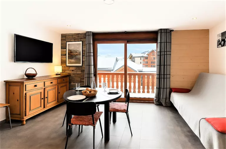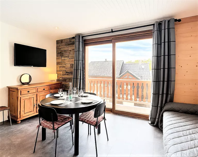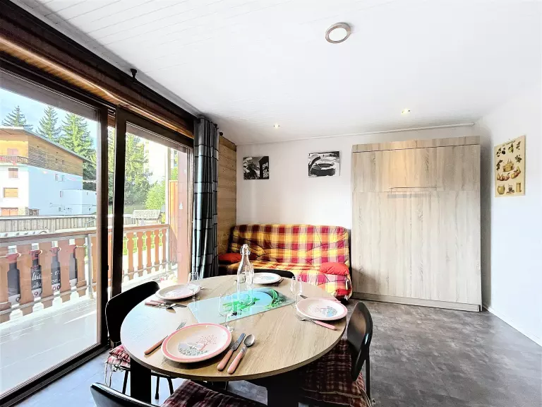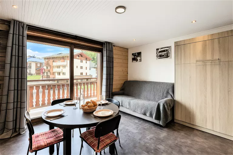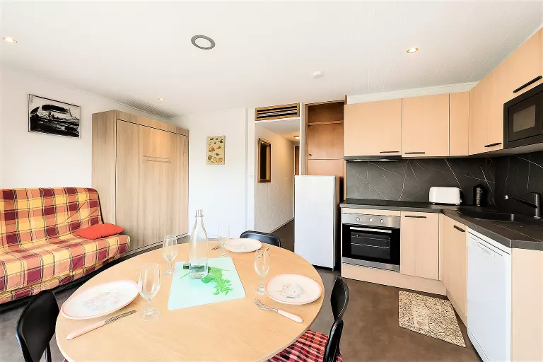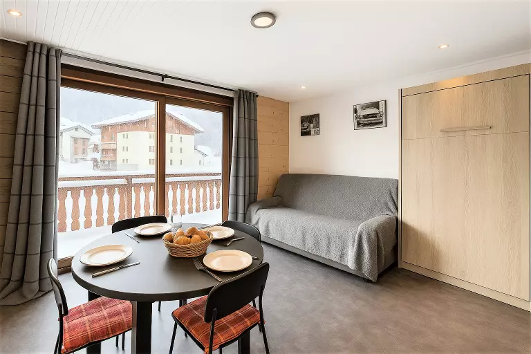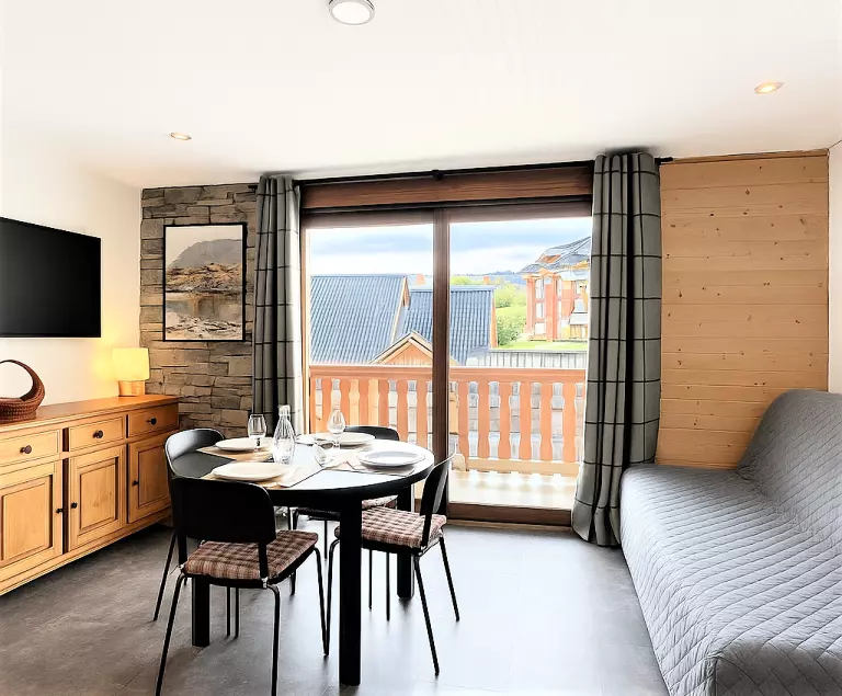 • D'un séjour avec un lit rabattable 2 personnes, un canapé fixe, une télévision à écran plat et un coin repas pour 4 convives.