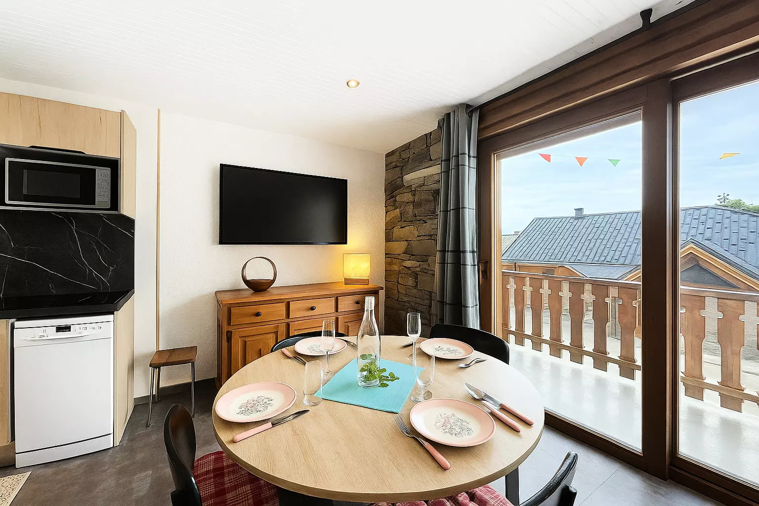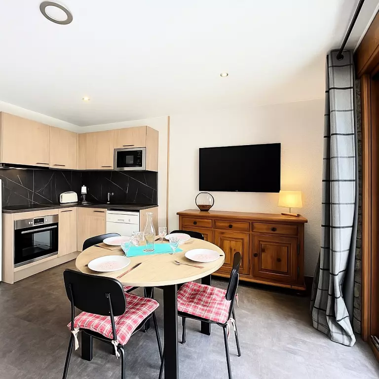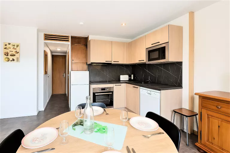• D'une cuisine ouverte entièrement équipée : plaque vitrocéramique, four traditionnel, micro-ondes, réfrigérateur, lave-vaisselle, cafetière électrique à dosette, bouilloire, grille-pain, etc...
