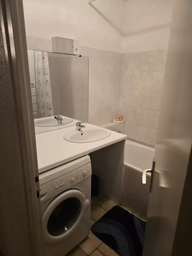 Salle de bain : lavabo, baignoire et lave-linge. WC indépendant.