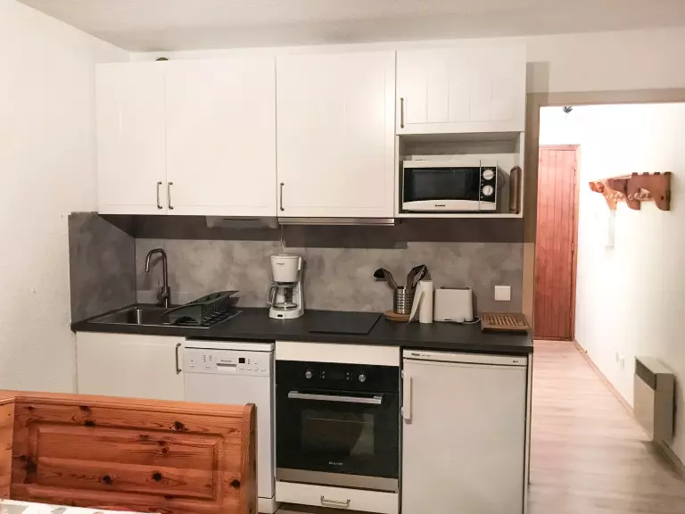 - Coin cuisine : four, réfrigérateur, plaques de cuisson et micro-ondes.