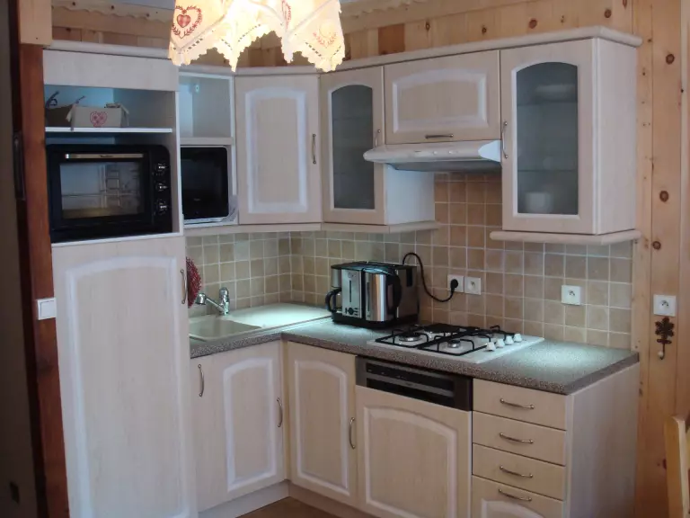- Coin cuisine : four, micro-ondes, lave-vaisselle, réfrigérateur (189L) congélateur (16L), plaque gaz (3 foyers) et plaque électrique (1 foyer).
