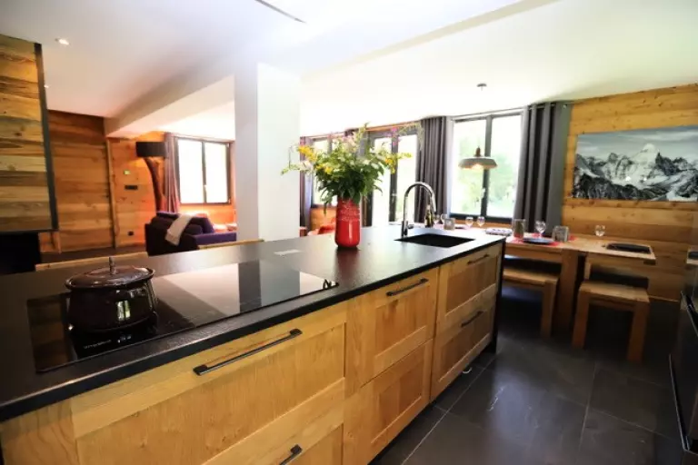 Coin cuisine (Niv 0) : four, micro-ondes/grill, réfrigérateur/congélateur, lave-vaisselle et plaque à induction (4 foyers).
