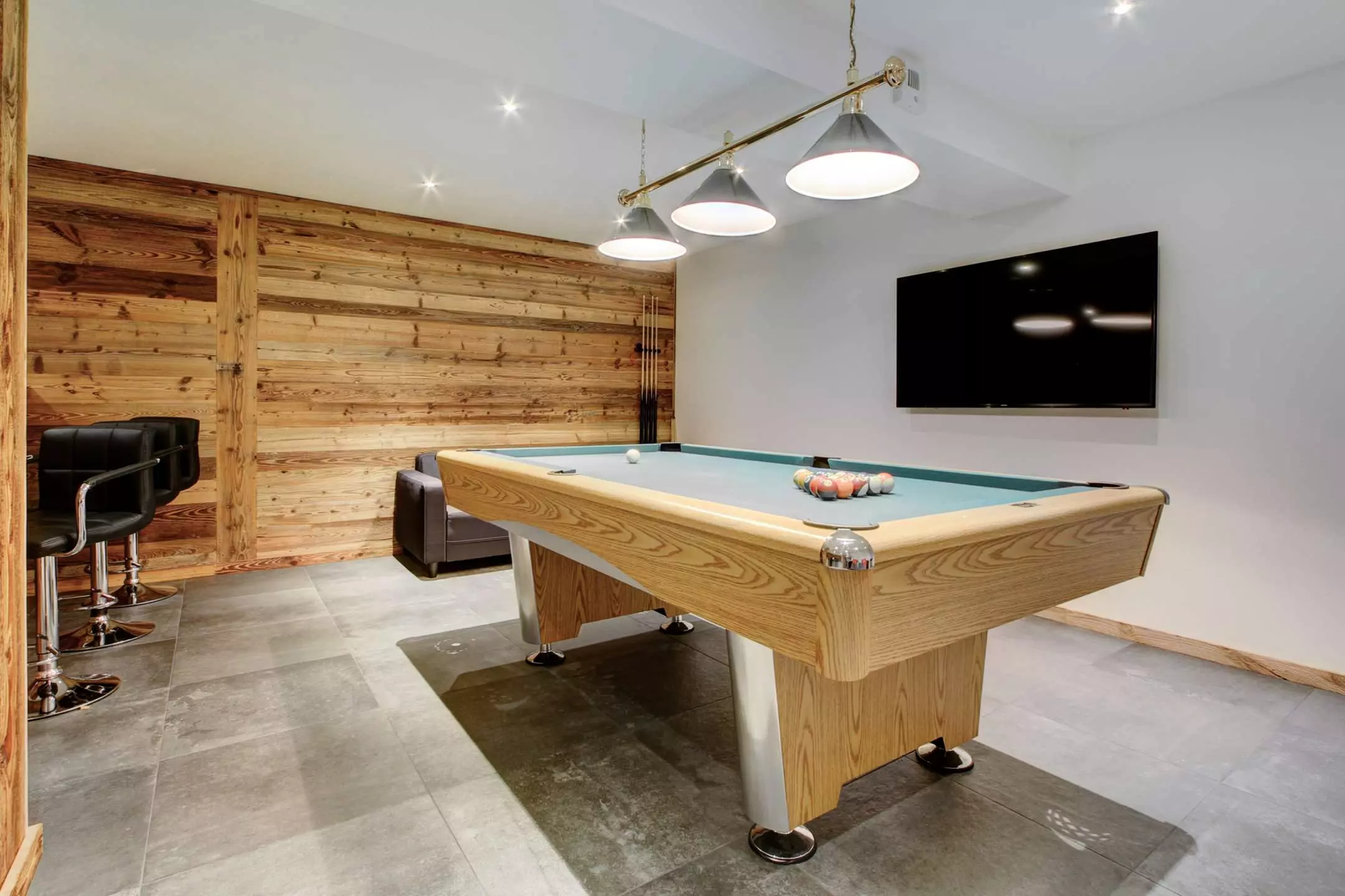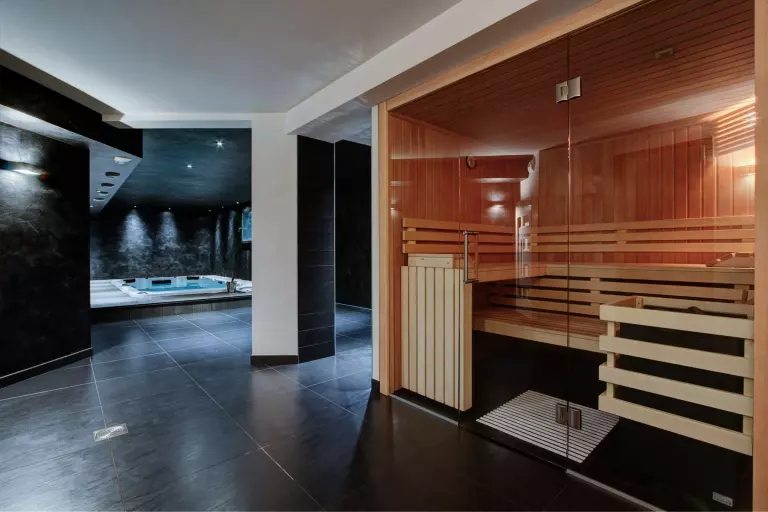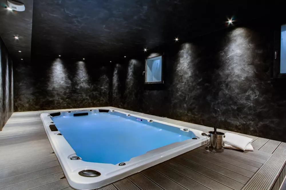 Sous-sol : salle de remise en forme avec spa de nage, sauna, salon avec billard et bar et buanderie