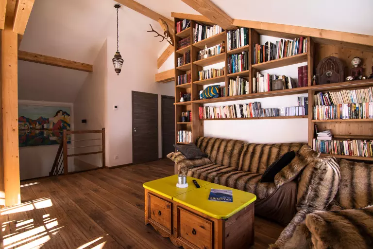 Espace bibliothèque en mezzanine (Niv +1/ 25m²) : bibliothèque, musique, jeux et télévision.