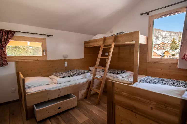 Chambre 2 "Dortoir" (Niv +1/ 14m²/ Ouest) : 3 lits simples + 1 lit superposé (4x 90x190cm) avec douche et lavabo