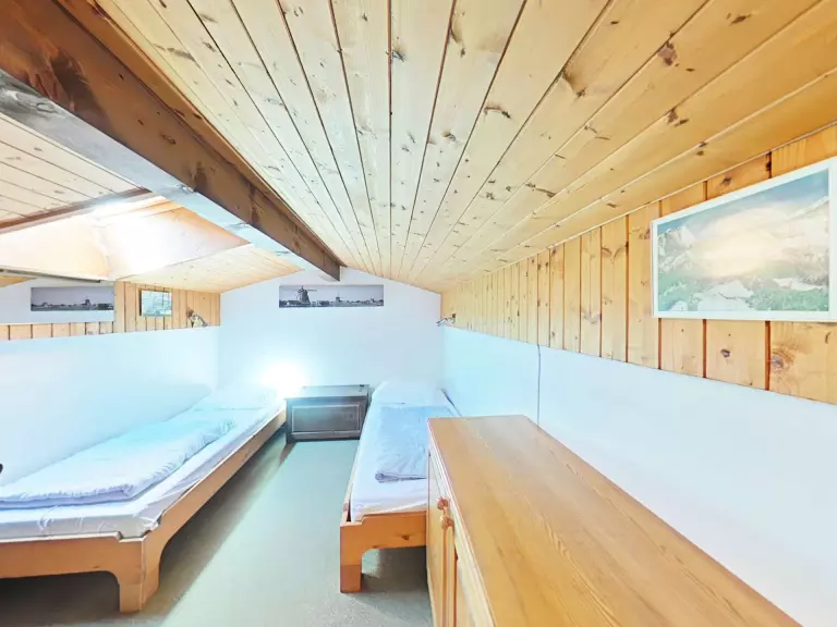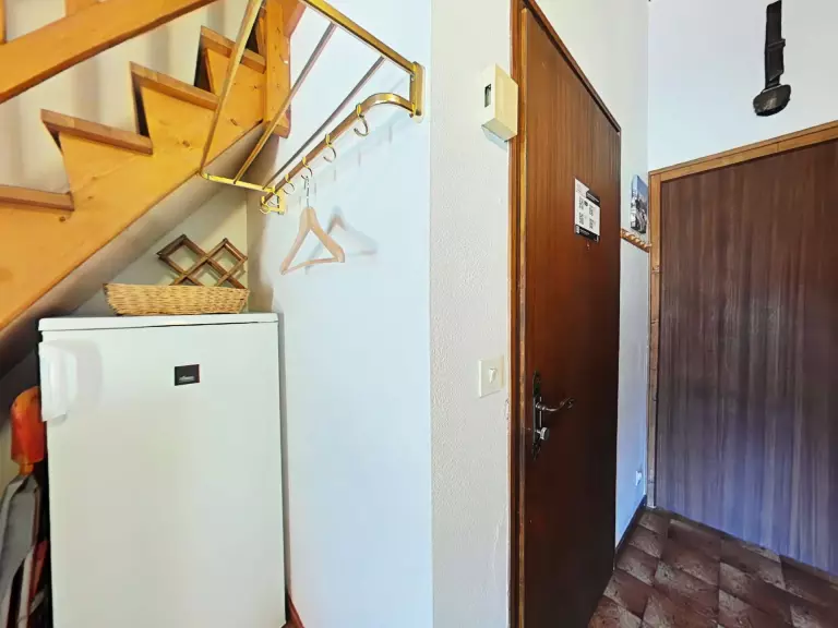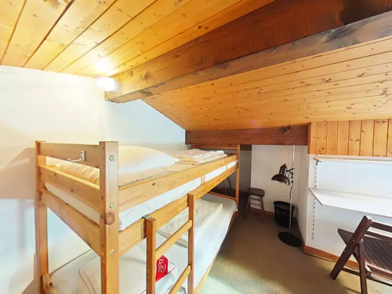 Cet appartement de vacances, au 3ème étage, comprend un séjour avec canapé d'agrément, télévision et cheminée, un coin cuisine équipé, une chambre avec un lit double(2 matelas 90 sommier double), une mezzanine sous pente (hauteur 1,50 m) avec 3 lits simples, une salle de bains et un WC indépendant.
