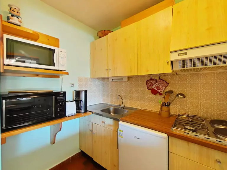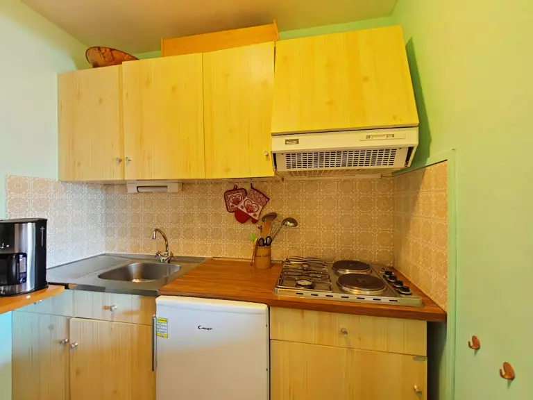 Cet appartement de vacances au 1er étage comprend un séjour avec un canapé convertible 2 personnes , un canapé tiroir (2 couchages) télévision, un coin cuisine équipé, une salle de bains et un WC indépendant.