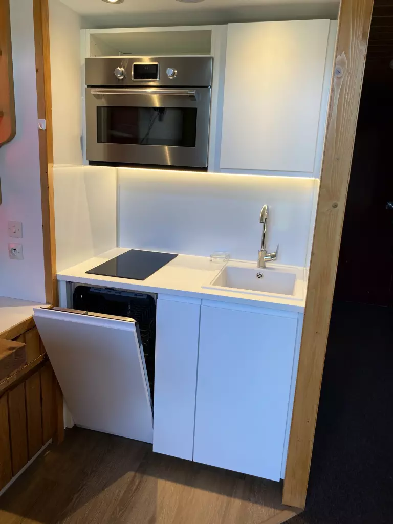 Le coin cuisine ouvert sur le séjour, est équipé de plaque vitocéramique, d'un four micro onde combiné, d'un réfrigérateur et d'un lave vaisselle.