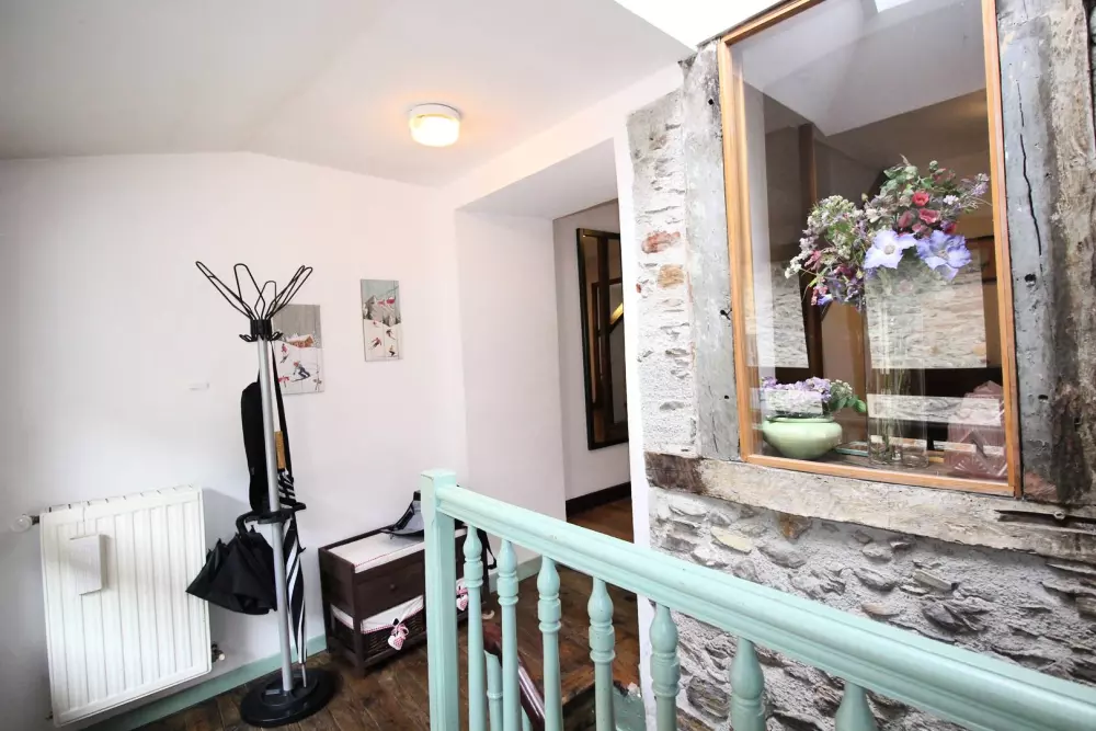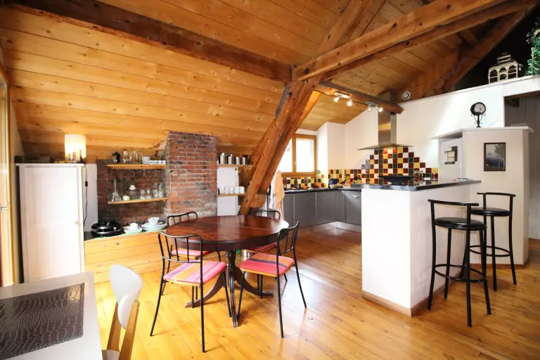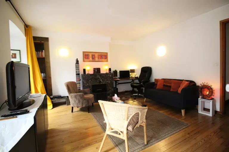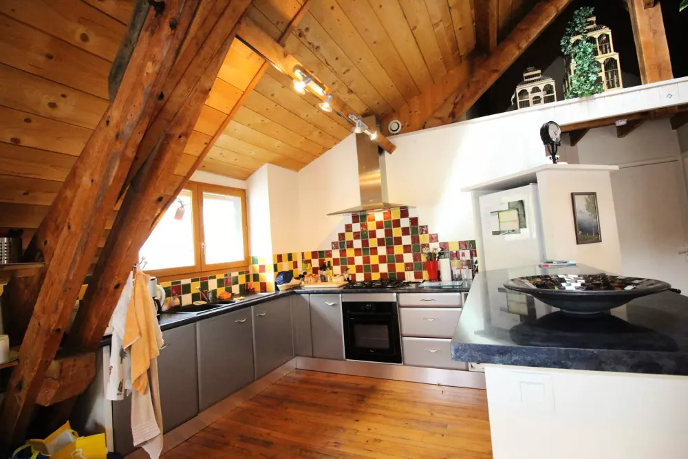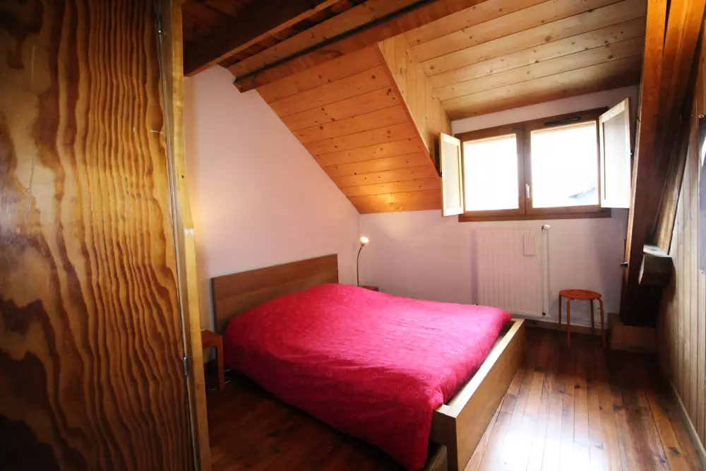 Au 2ème étage, grand séjour climatisé avec poutres apparentes de 40 m² avec 2 portes fenêtres et 2 fenêtres avec coin salon et tv lcd, une kitchenette équipée (lave-vaisselle, four, micro-ondes, réfrigérateur-congélateur), une chambre avec lit 140, une salle de bains, un wc. parquet massif au sol.