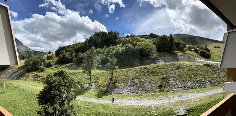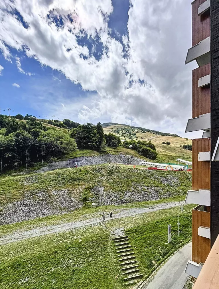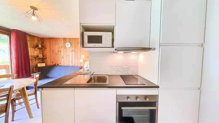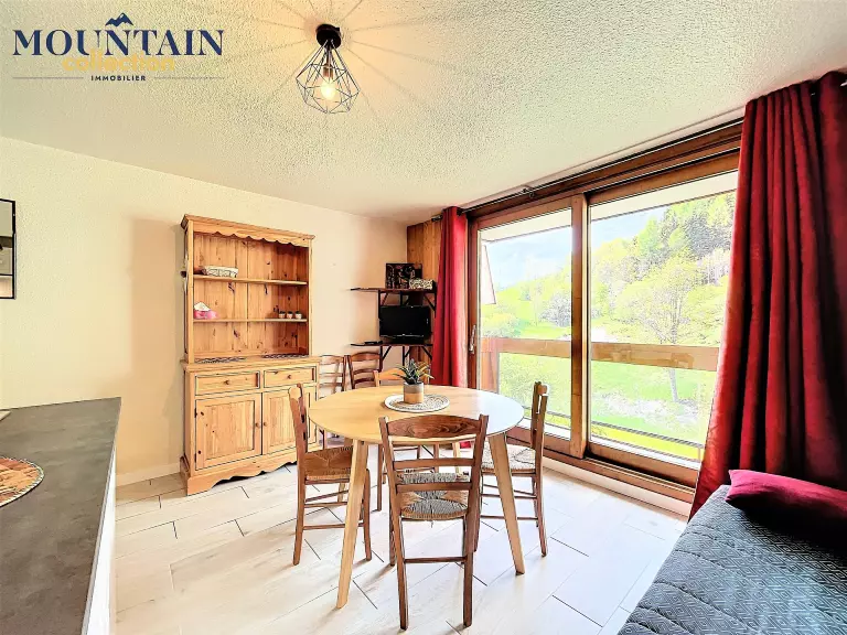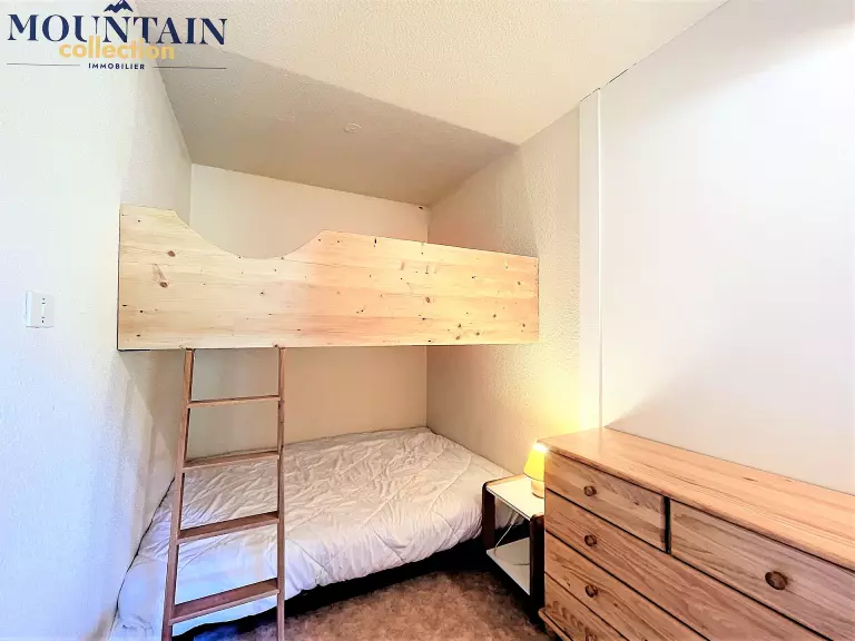 Un séjour lumineux bien aménagé, équipé d'1 canapé clic clac en 130X190 et d'une télévision à écran plat, ouvre sur un balcon vue pistes. Une alcôve fermée avec 2 lits doubles en 140X190 superposés, une commode. Logement équipé de couettes, prévoir housses de couettes.