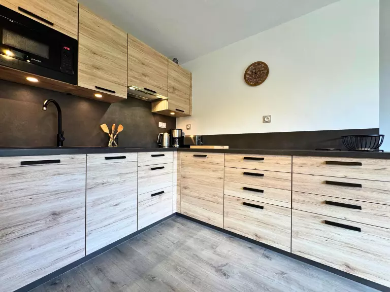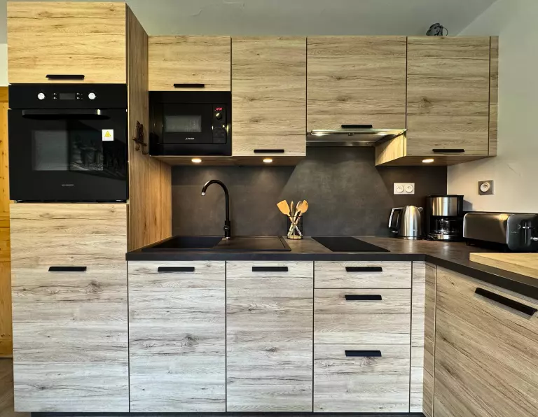 Coin cuisine : plaques de cuisson vitrocéramiques (x2), micro-ondes, frigo (partie freezer), cafetière Dolce Gusto, cafetière à filtre, grille-pain, bouilloire, lave-vaiselle, apareil à raclette