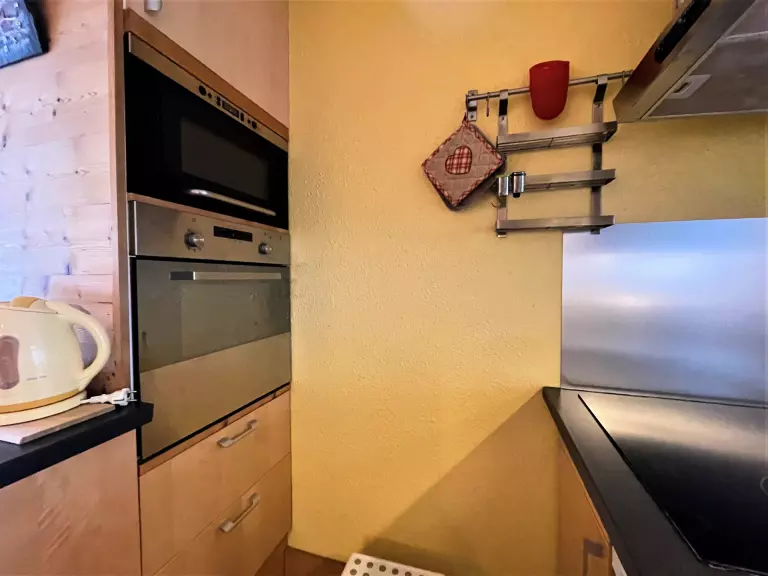 Cuisine : plaques induction (x3), four traditionnel, micro onde, réfrigérateur avec congèlateur de 10L, lave-vaisselle, cafetière, bouilloire, grille pain