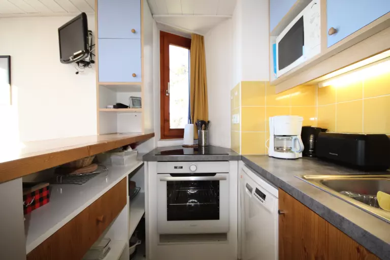 Le coin cuisine est équipé de : plaques électriques, four, micro-ondes, réfrigérateur et lave vaisselle.