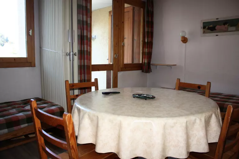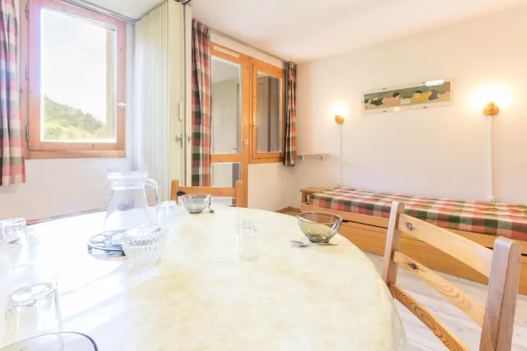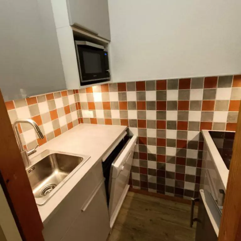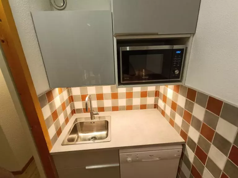 Ce studio avec terrasse plein sud donnant sur la piste de Montchavin se compose d'une kitchenette équipée (plaques vitrocéramiques 3 feux, grille-pain, cafetière électrique, lave-vaisselle, four combiné micro-ondes, réfrigérateur avec petit congélateur), d'une salle de bain baignoire et wc séparé.