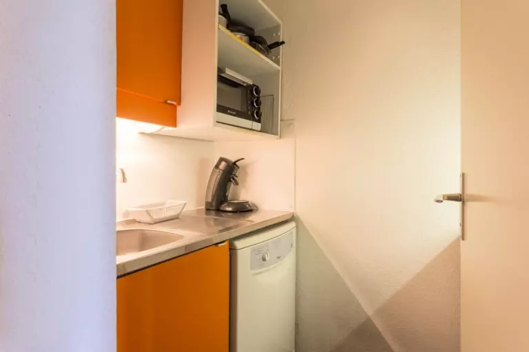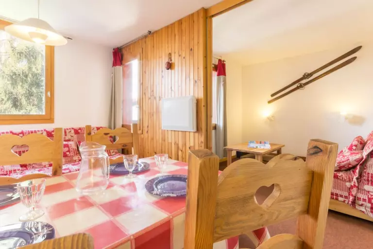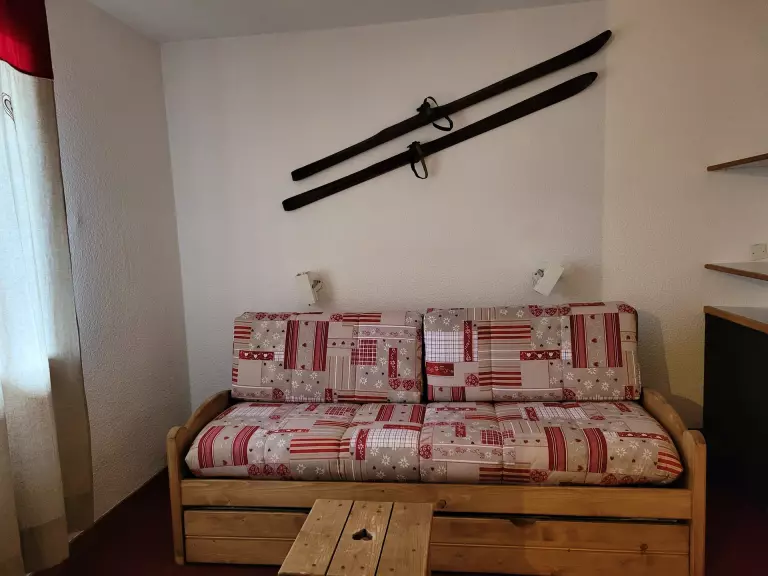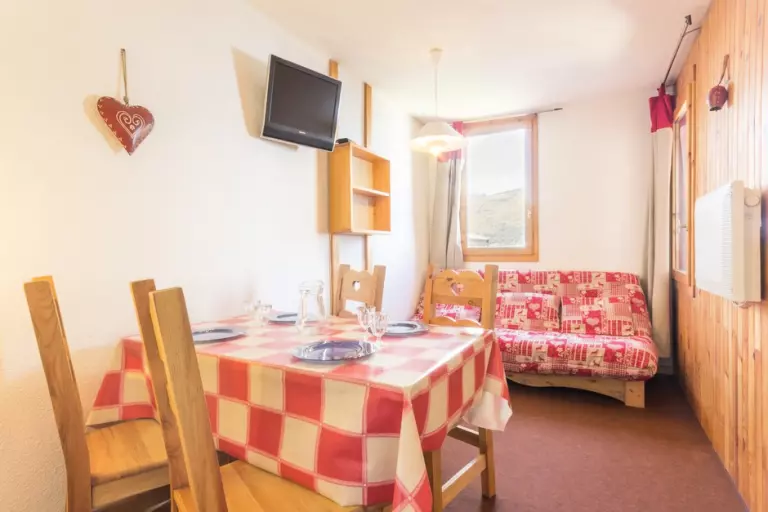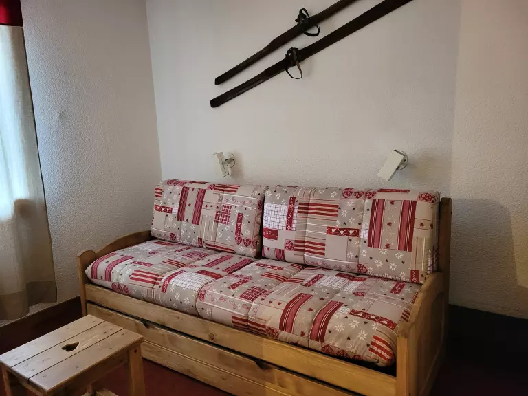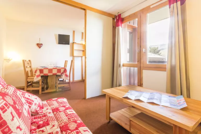 Ce studio divisible à proximité des pistes se compose d'une kitchenette équipée (de plaques électriques, cafetière Senseo, combi four/micro-ondes, lave-vaisselle, grille-pain), d'une salle de bain avec baignoire et WC séparé. Dans la salle à manger vous disposez d'un canapé clic-clac en 140. Le salon est équipé d'un ensemble canapé lit gigogne (2*80).