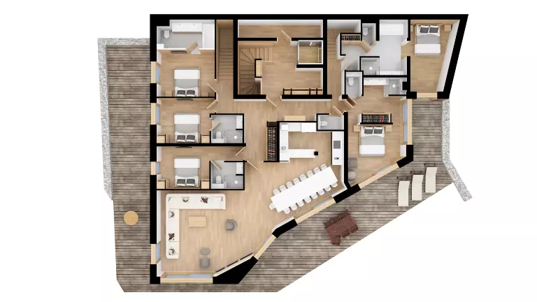 Duplex d'environ 270m² situé dans la résidence "LES BELLES ALPES". Il est équipé pour 10 adultes et 4 enfants avec 6 chambres et un sauna. Exposé sud-ouest, il est situé à 150mètres du télésiège du Golf et de la piste du Lapin et 60m des commerces du Village. Une navette gratuite vous emmène en quelques minutes dans le centre de Méribel.