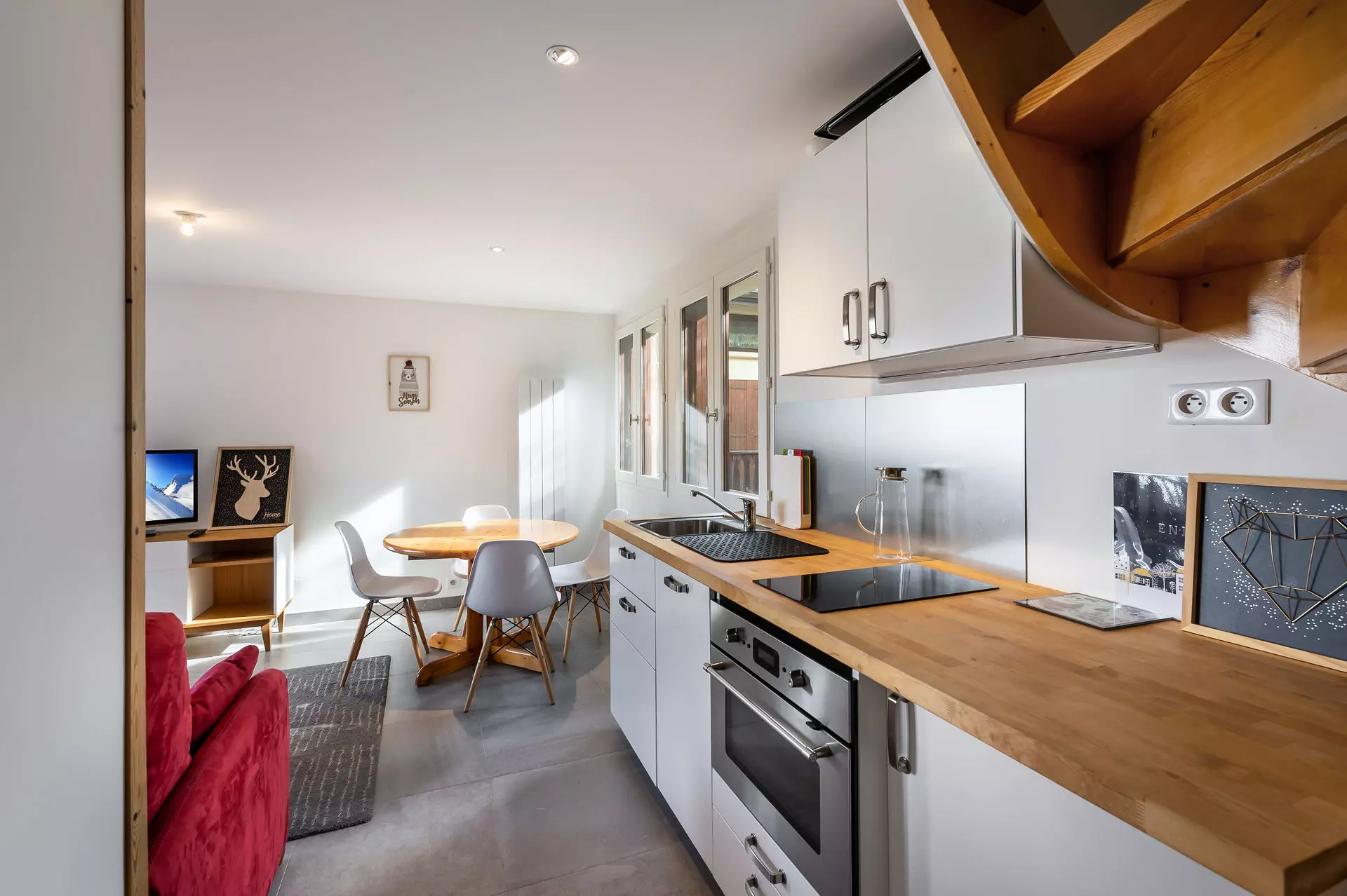 - Cuisine ouverte équipée : four microonde-grill, lave-vaisselle, Nespresso, grille pain, bouilloire, frigo, plaques de cuisson