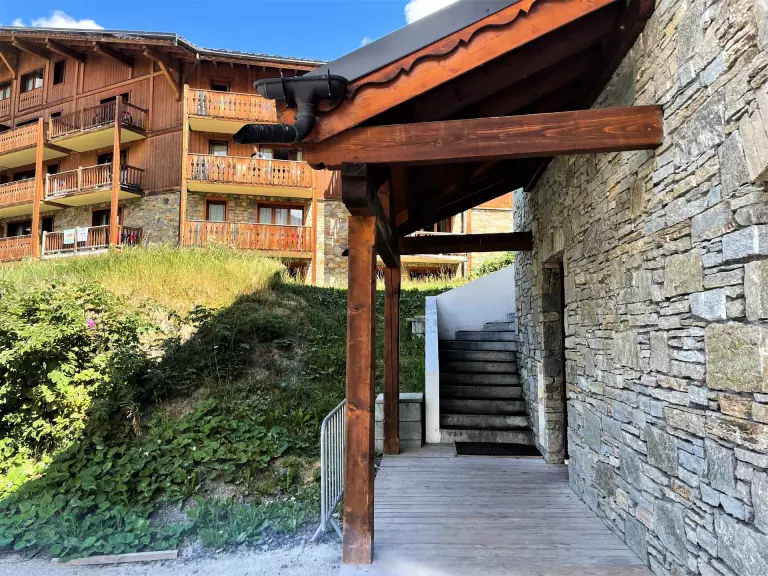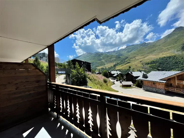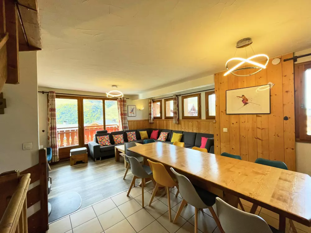 Résidence Les Chalets de Geffriand n° 1 (Kayleigh), 6 pièces pour 10 personnes 116m², au 1er étage par escaliers, balcon exposé Ouest, vue dégagée sur La Masse et la Vallée des Belleville, proche des pistes