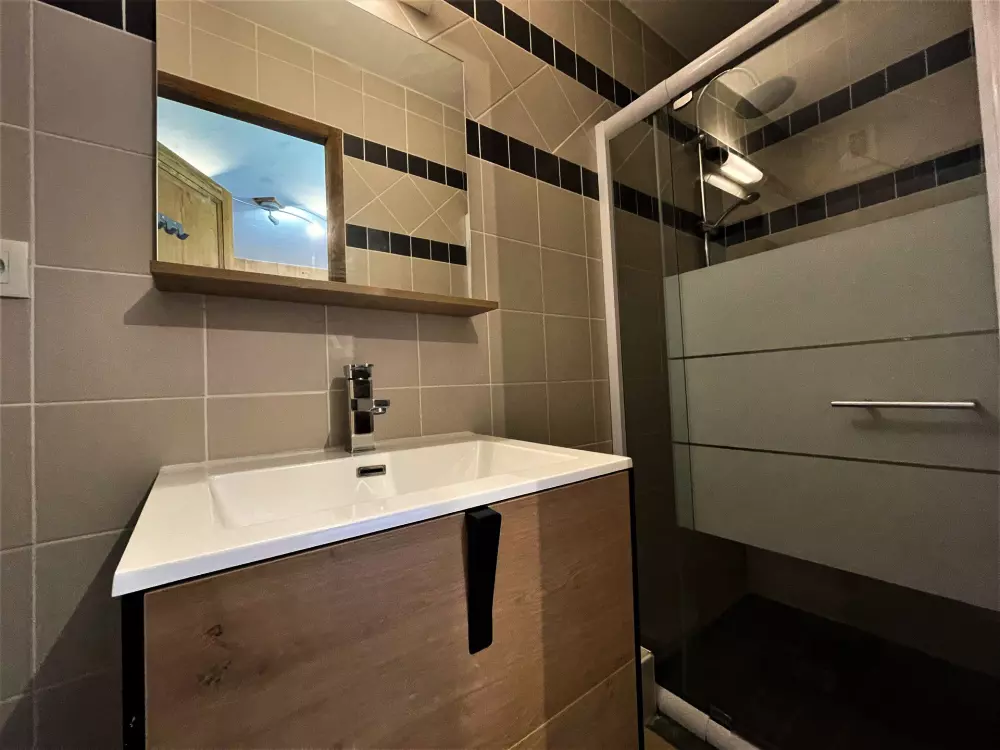 Salle de bain : douche et lavabo sèche serviettes, sèche cheveux