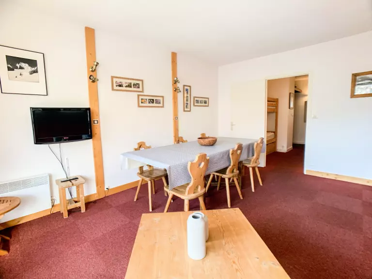 Salon avec coin repas, une banquette lit simple et un lit gigogne (3 couchages simples) - télévision
