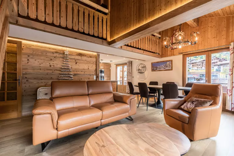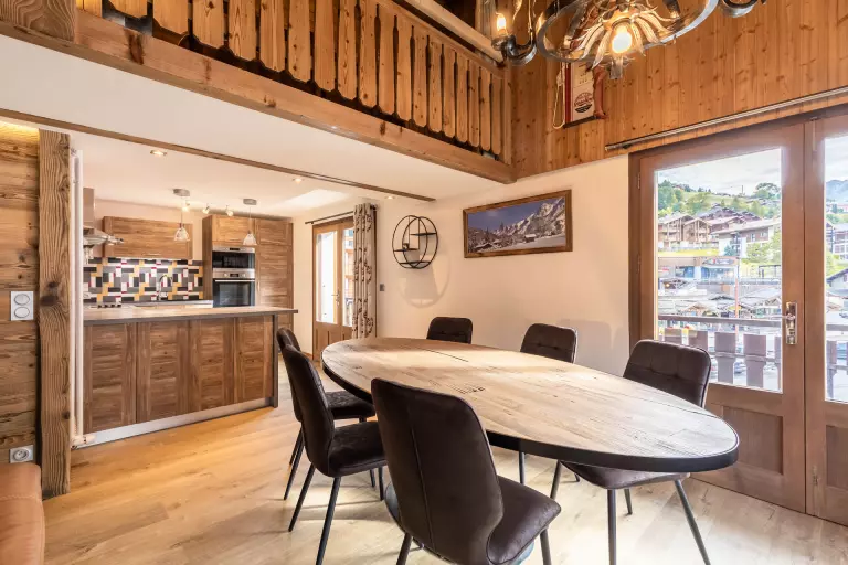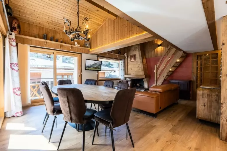 - SEJOUR (36.98 m²) : coin repas, canapé, TV écran plat, CHEMINEE DECORATIVE, porte fenêtre, accès balcon est, vue Parking de la Perrière / résidences voisines / montagnes, baie fixe + porte fenêtre, accès balcon sud, vue résidences voisines / pistes / montagne