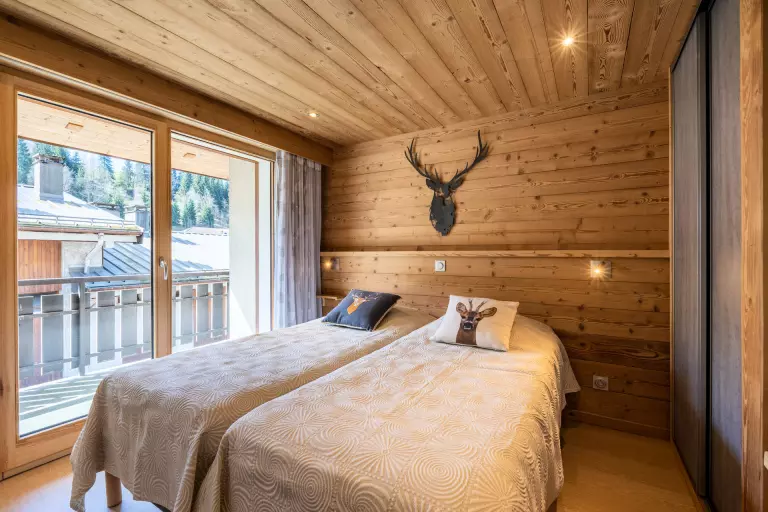 - CHAMBRE (10.28 m²) : 2 LIT 1 PLACE (80), baie + porte fenêtre, accès balcon sud, vue résidences voisines / pistes / montagne